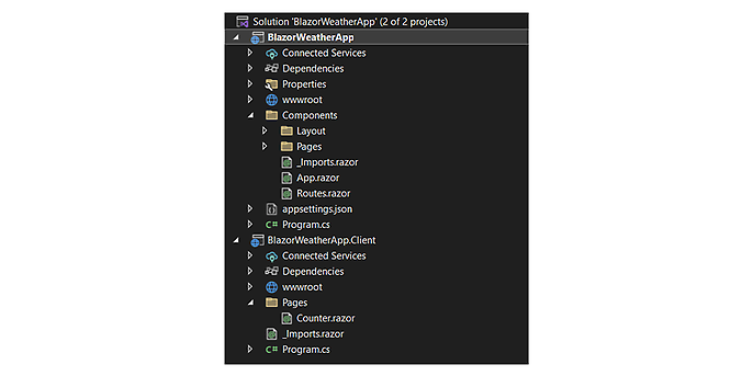 The BlazorWeatherApp.Shared project contains classes that are used by both the server project (BlazorWeatherApp) and the client project (BlazorWeatherApp.Client).