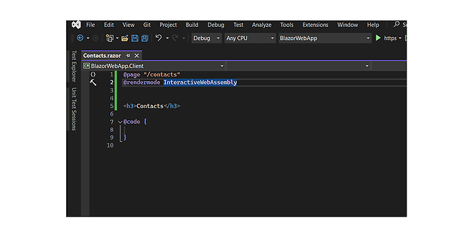 This project template allows us to write both server-side and client-side rendered components in an app. It also solves the problem of long loading times on first launch. If the page uses rendering mode "Auto", then the application uses server-side rendered pages at startup and switches to using WebAssembly with all its advantages as soon as all required DLLs have been transferred to the client. If the WebAssembly version does not work, the application automatically reverts to a server-side rendered page. Let's write an example for this page.