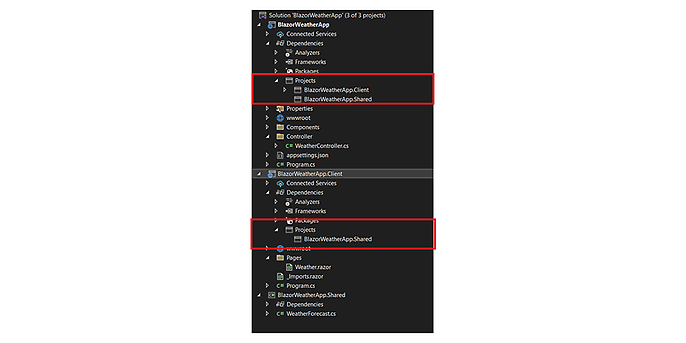 I created the model (WeatherForecast) in the BlazorWeatherApp.Shared project. This project is a simple class library that is referenced by both the BlazorWeatherApp.Client and the BlazorWeatherApp. The final project structure in the solution looks like this: