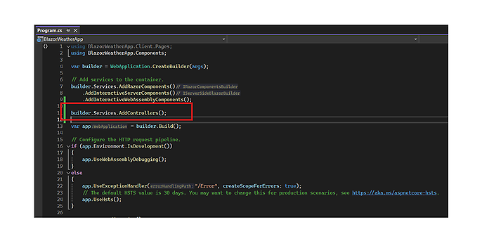 Since we use a controller to retrieve data from the server, we need to add the necessary ASP.NET Core Services to the dependency injection using the AddControllers() method.
