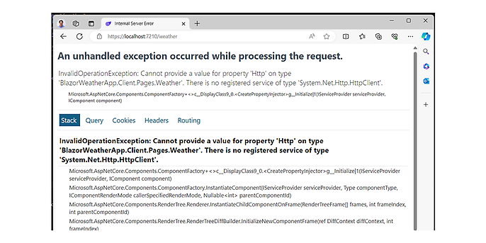 When you start the project, the page should logically be rendered interactively in WebAssembly in the browser. But when you call up the Weather page, you get an error instead: