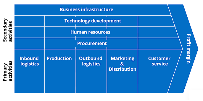 The value added model developed by Porter shows the value chain of a manufacturing company. In his model, Porter differentiates between primary and secondary value added processes. The primary value added processes convert incoming production factors into products. These are sold on the market via marketing and sales. The secondary value added processes (corporate infrastructure, human resource management, technology development and procurement) are support functions for the primary functions.